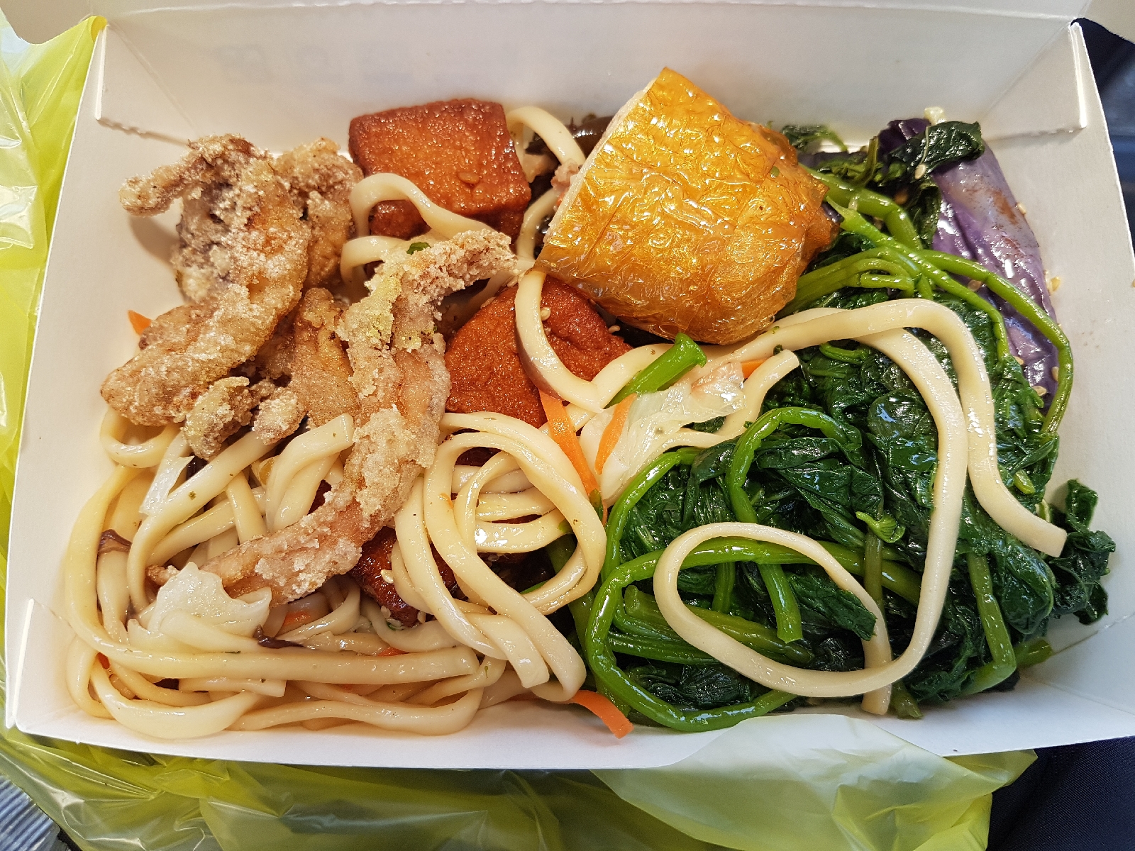 | A bit of noods, some greens, eggplant, marinated tofu, and mock meats |